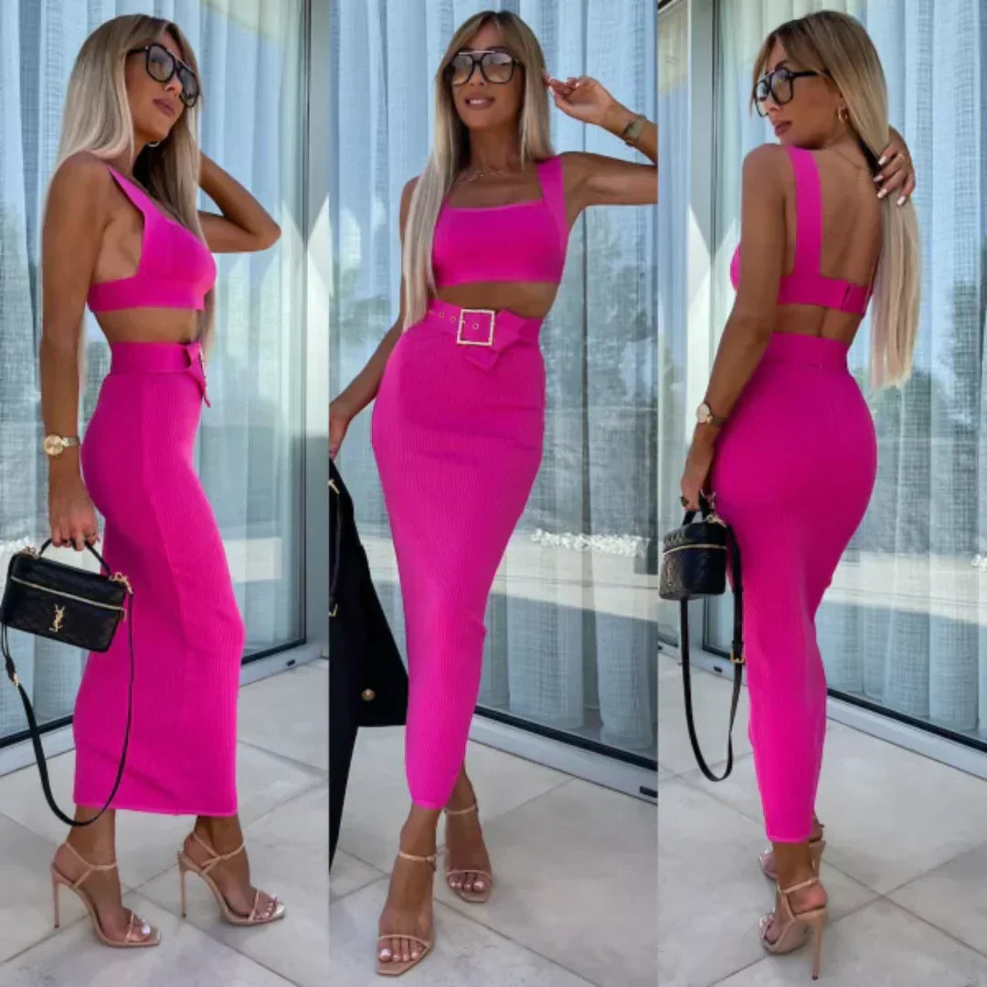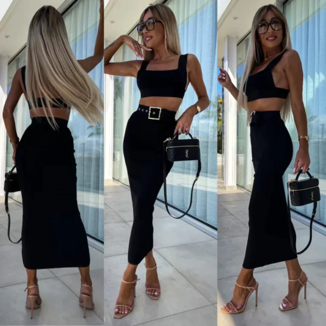 2-delige Set - Isla - Geribbelde Stof, Elastische Bandjes, Gouden Gesp Riem - Perfect voor Moderne Gelegenheden