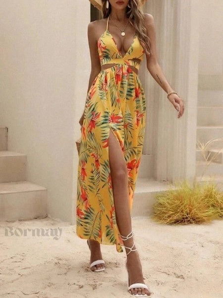 Eileen - Jurk met print, open achterkant, vlinderdas en split bij de halslijn