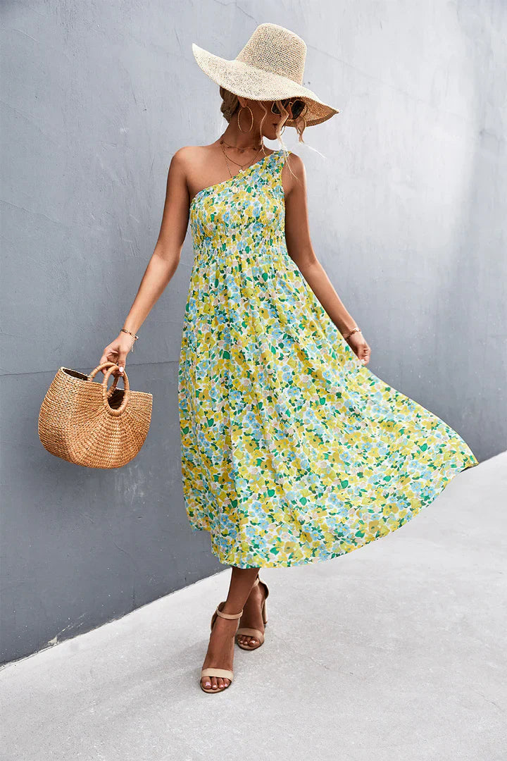 Gracen - Halflange jurk met bloemen en gerimpelde schouders