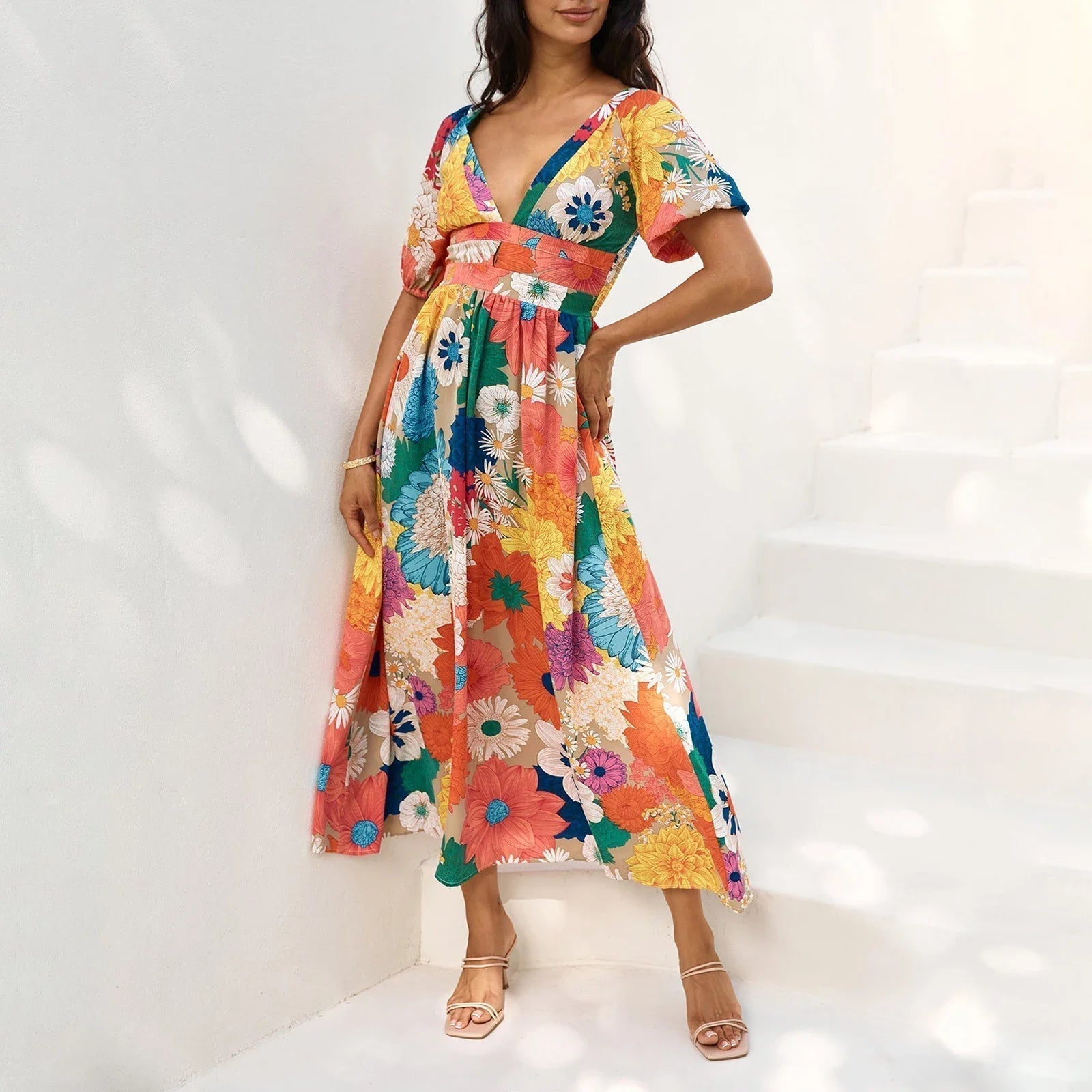 Lange jurk met bloemenprint en korte pofmouwtjes